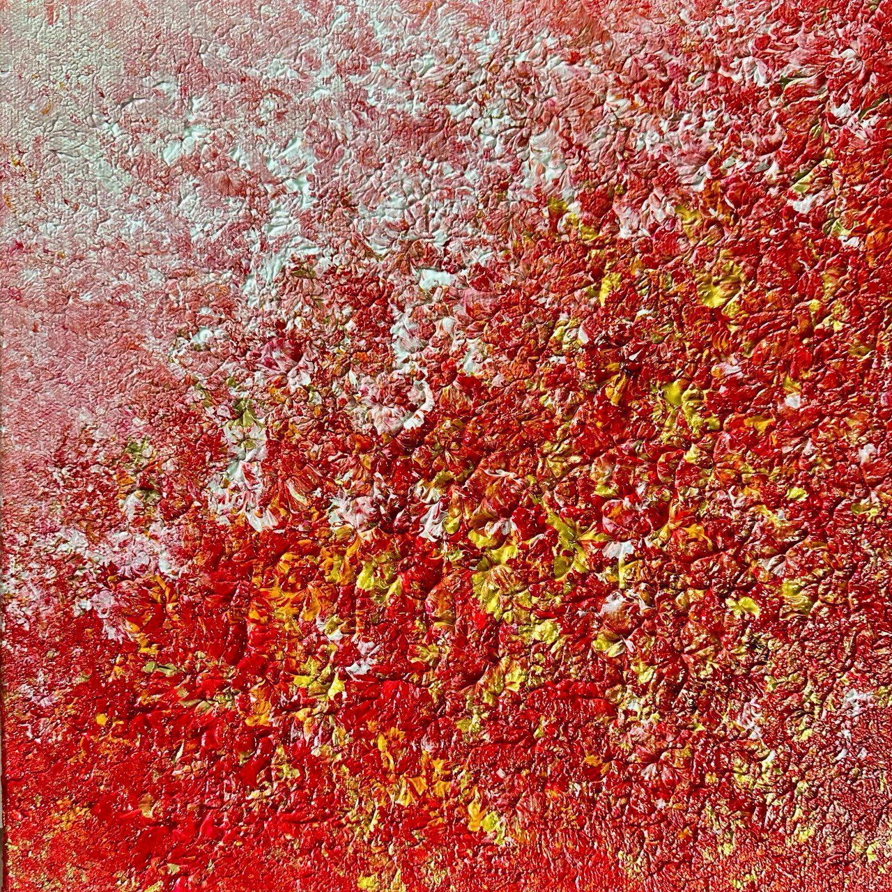In Full Bloom was created in a single sitting using a dabbing technique, allowing wet paints to blend naturally, forming rich layers and depth. Inspired by Wendy's love for flowers, this piece evokes the image of a garden in full bloom; alive, radiant, and joyful. Varying shades of red bring vibrancy, while each stroke captures the energy of blossoms dancing under the sun, celebrating nature's vitality and the beauty of being fully present. Wendy is an Intuitive Abstract Artist based in Singapore. A former graphic design trainee, she paints primarily with acrylic on canvas, using an intuitive approach rooted in personal expression. Her works have been exhibited locally in Singapore and internationally in countries such as New York (USA), India, Japan, Philippines, Korea, Turkey and France. This was exhibited at the recent exhibition Spicy at TAG.