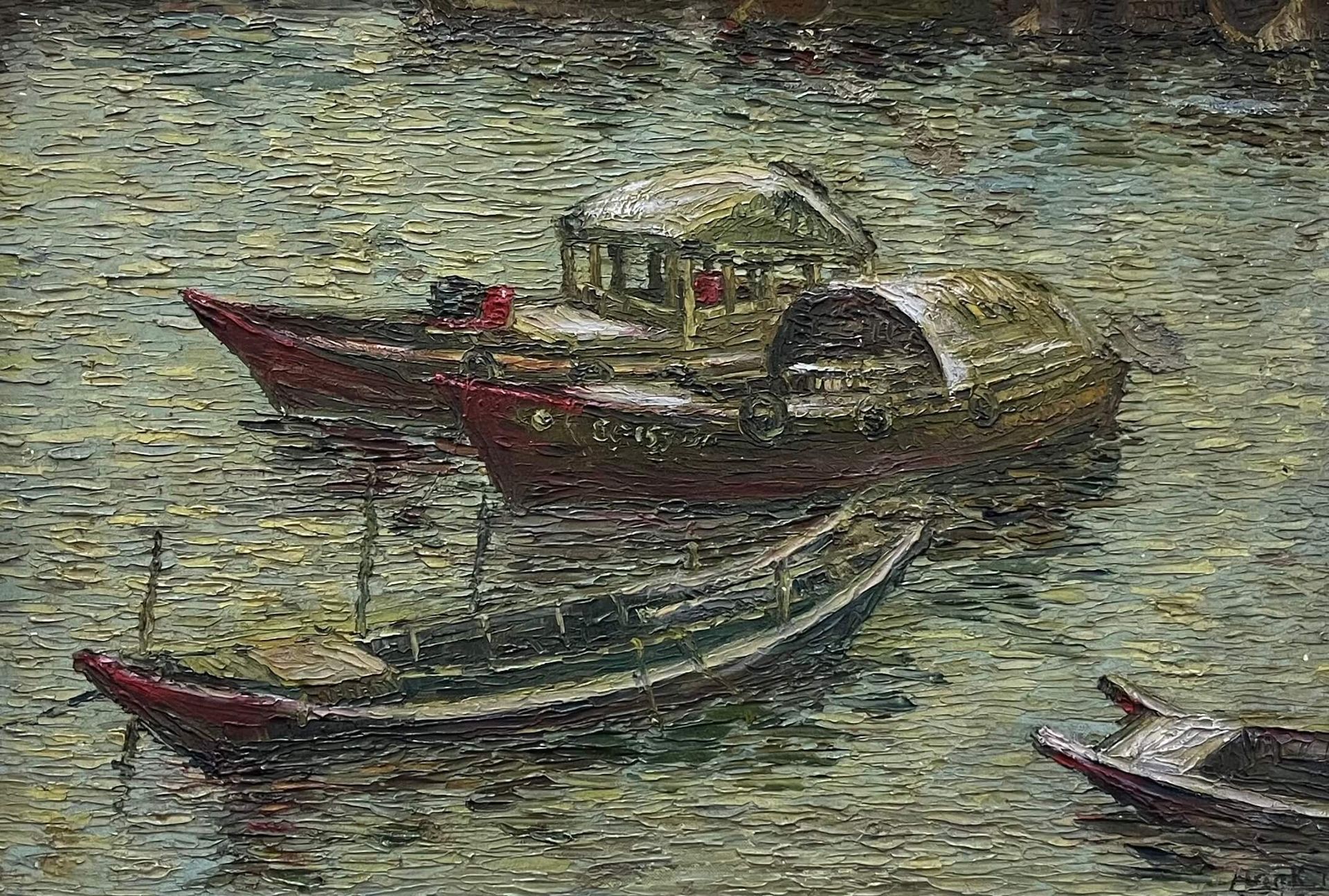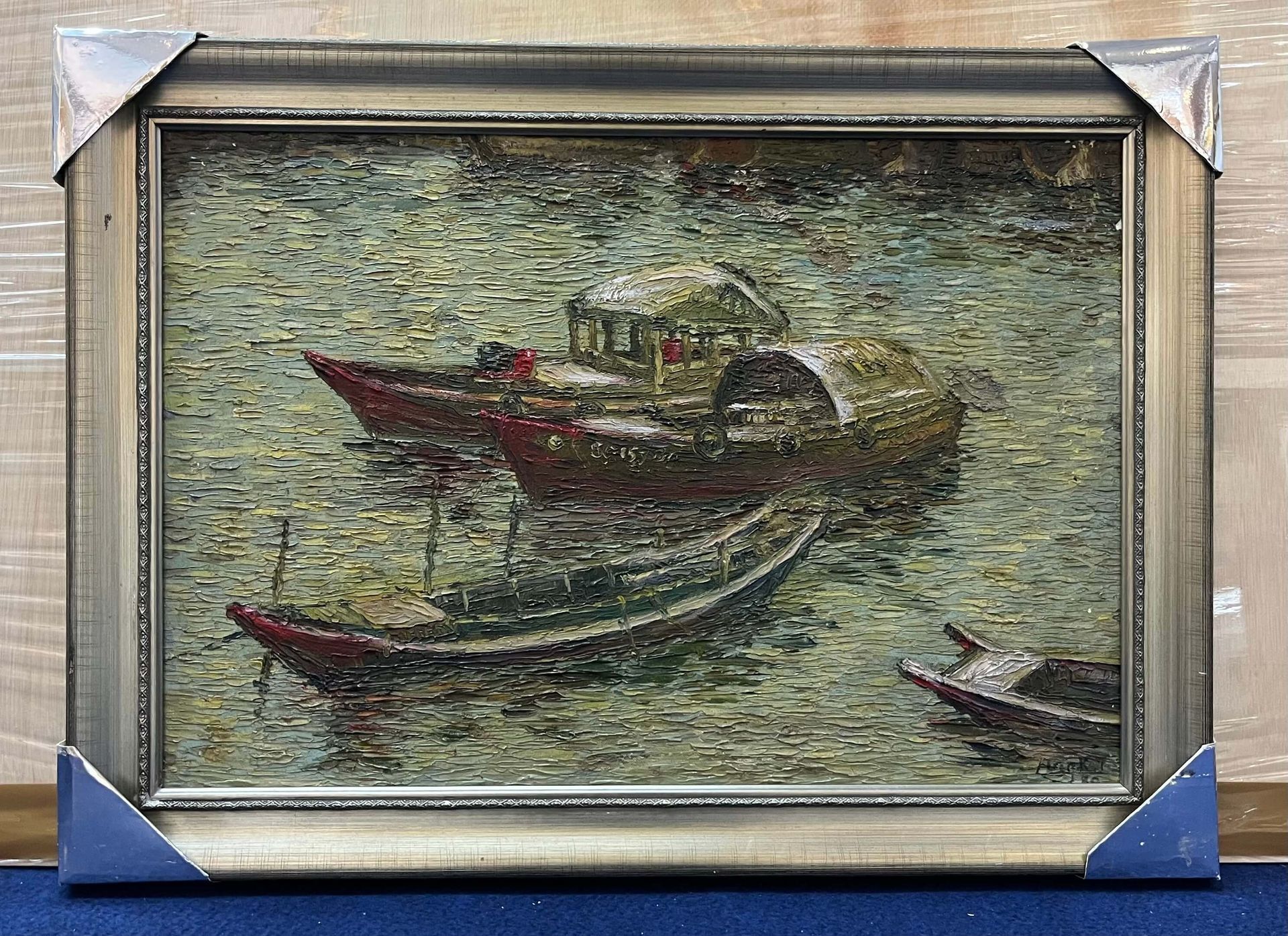 1980 painting of the bum boats on the Singapore in oil on canvas with a nice silver frame.