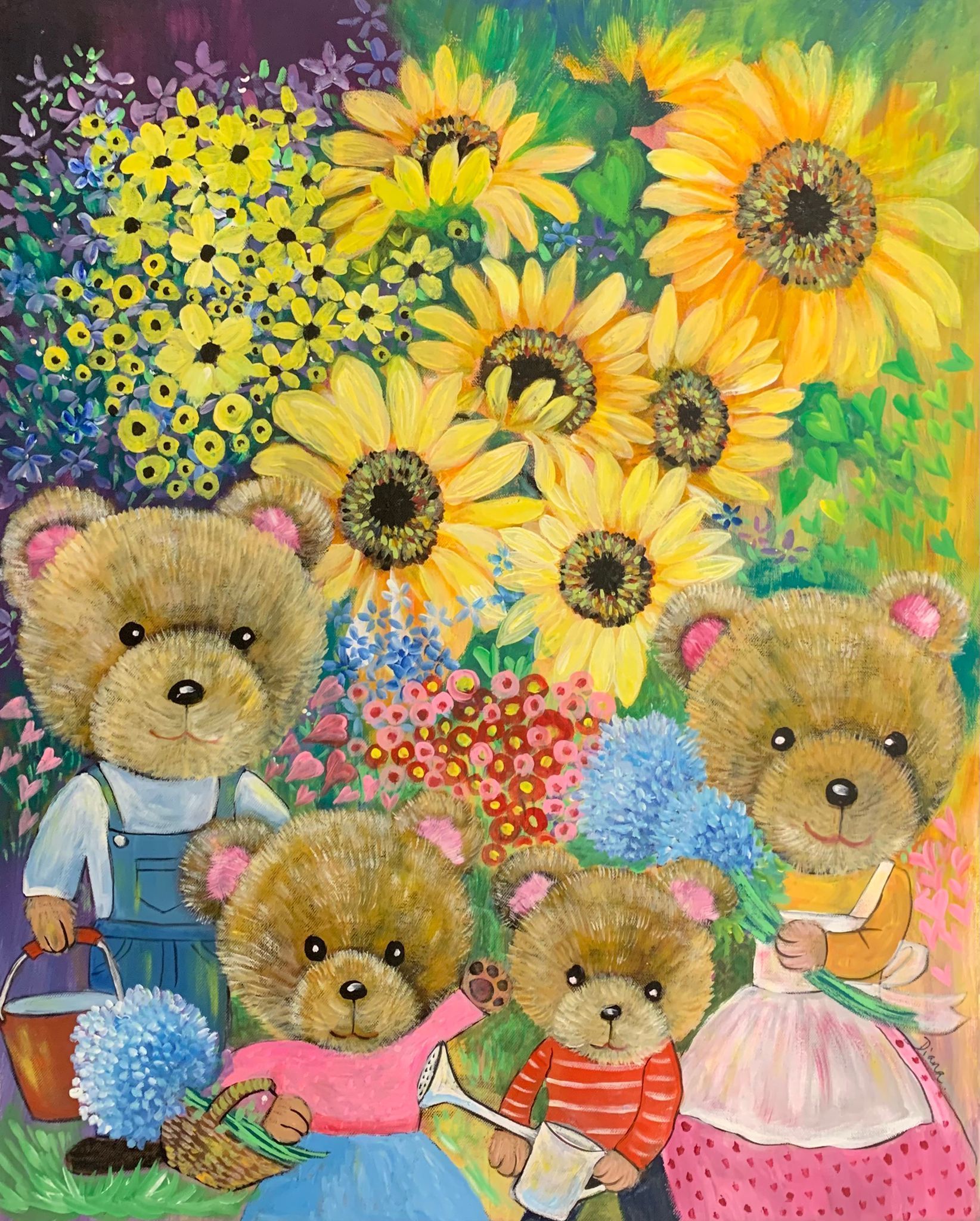This painting feels like a cozy storybook moment brought to life 🌻🧸. It shows a family of teddy bears standing together in a lush, colourful garden bursting with flowers. Big, radiant sunflowers dominate the background, their golden petals popping against rich greens, purples, and blues. Around them are clusters of smaller blossoms—pinks, yellows, blues—layered densely so the whole scene feels alive and overflowing. The bears are dressed like gentle, old-fashioned story characters. Overall, the painting radiates warmth, innocence, and togetherness. It feels like a celebration of family, nature, and gentle joy—something that would fit perfectly in a children’s room or anywhere you want a little comfort and happiness to bloom 🌼.