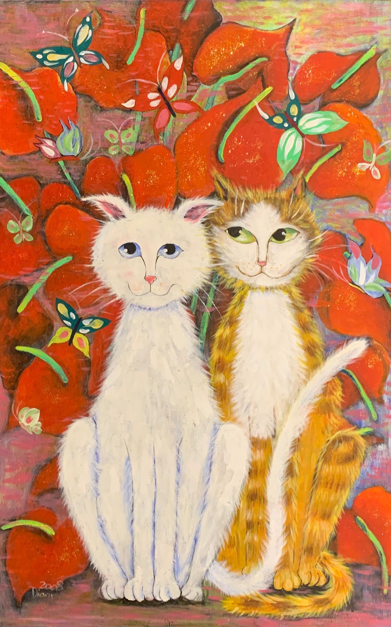 A bright lively painting of two lover cats nestled amongst red vivid blooms and fluttering butterflies. The overall feel of this painting is playful, dreamy, and folk-art inspired. Diana Lim is a Singaporean artist who teaches watercolour to adults for more than twenty years. Her bubbly personality shows through her artworks.
