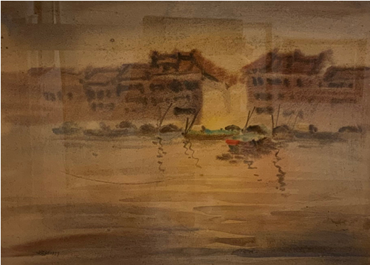 A 1979 painting of the Singapore River in watercolour in warm hues that is nostalgic and poignant.