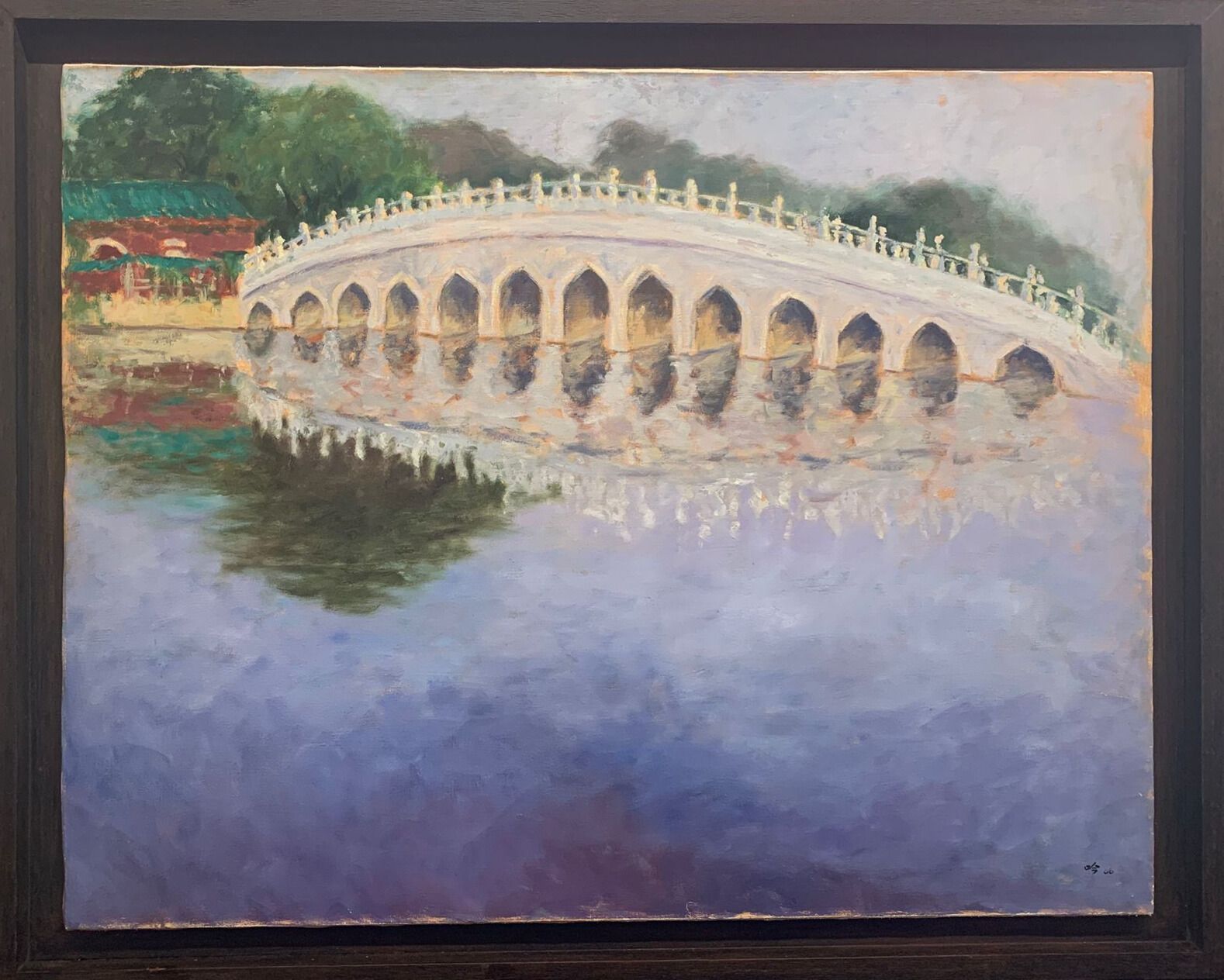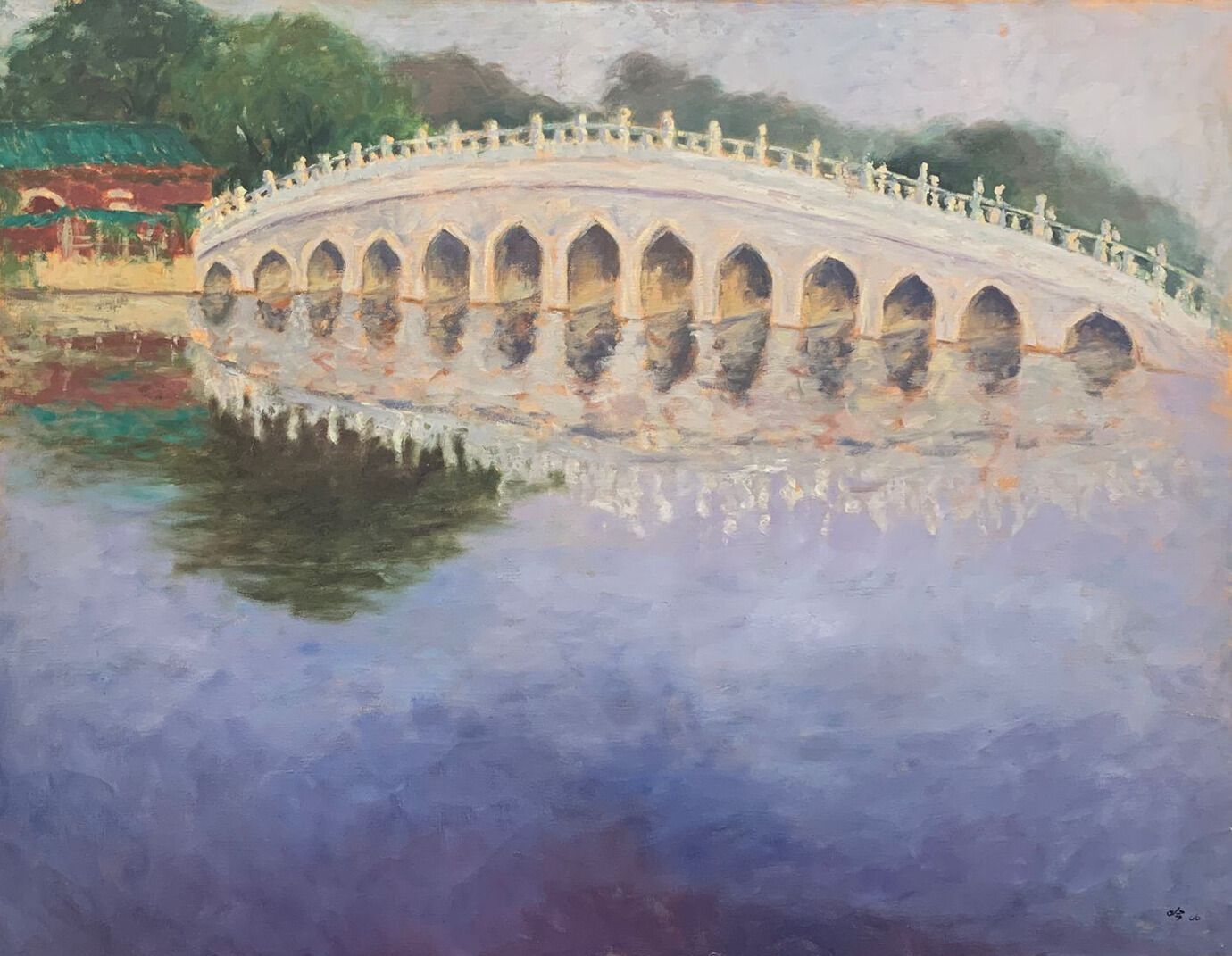 Tan Ai Ngin (1972–2013) was a Singaporean artist known for her oil paintings capturing the nostalgic charm of old Singaporean neighbourhoods, such as Tiong Bahru and Kampong Bahru. A graduate of the Nanyang Academy of Fine Arts and School of Fine and Performing Arts Constantijn Huygens in Holland, Tan was known for her plein-air style and vibrant, short-stroked scenes. The soft brushstrokes and muted colours of this painting create a tranquil, reflective atmosphere with the bridge mirrored gently on the calm waters.