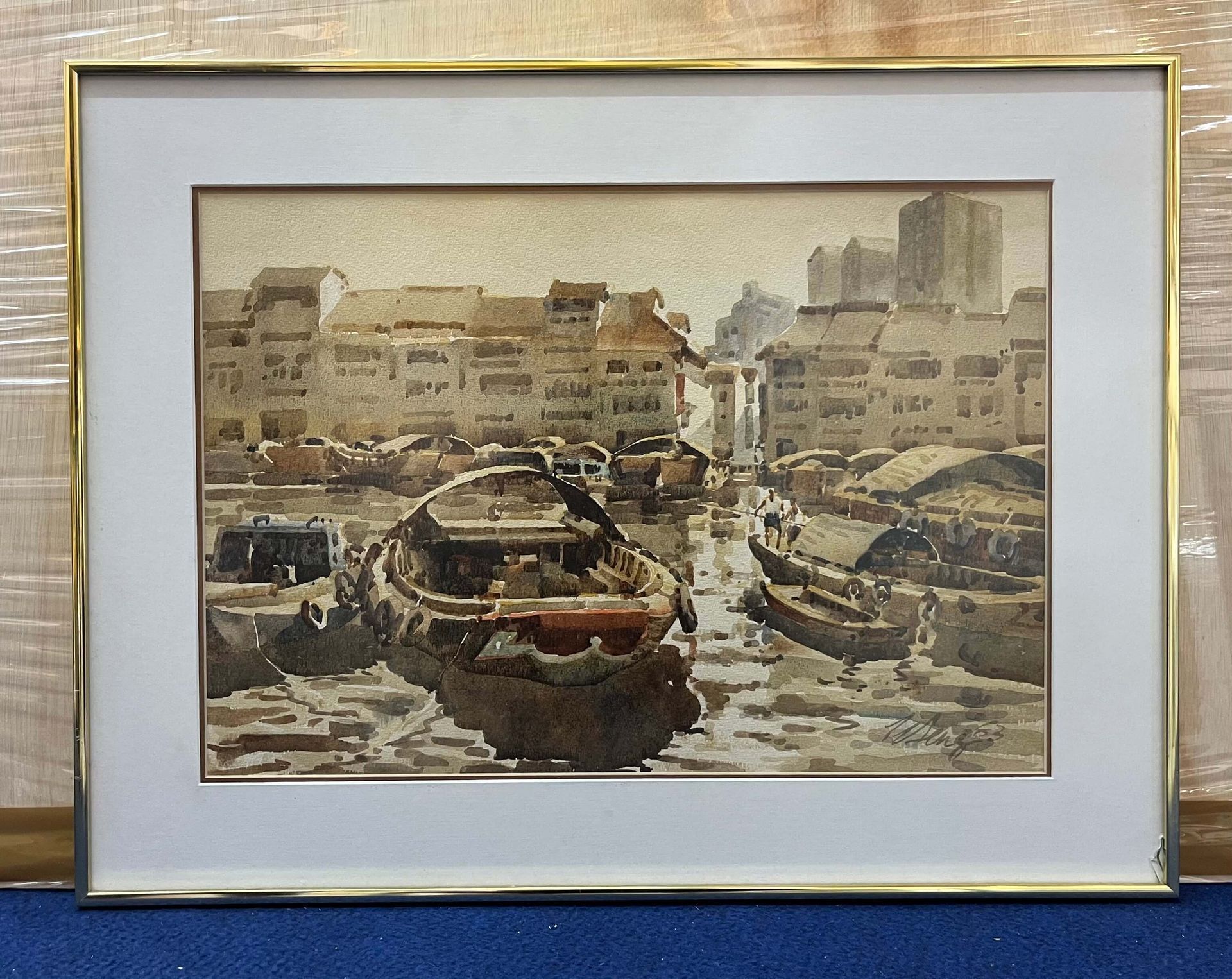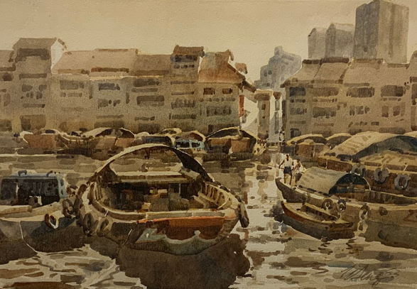 A classic watercolour painting of the Singapore River with bum boats by Cultural Medallion artist Ong Kim Seng.