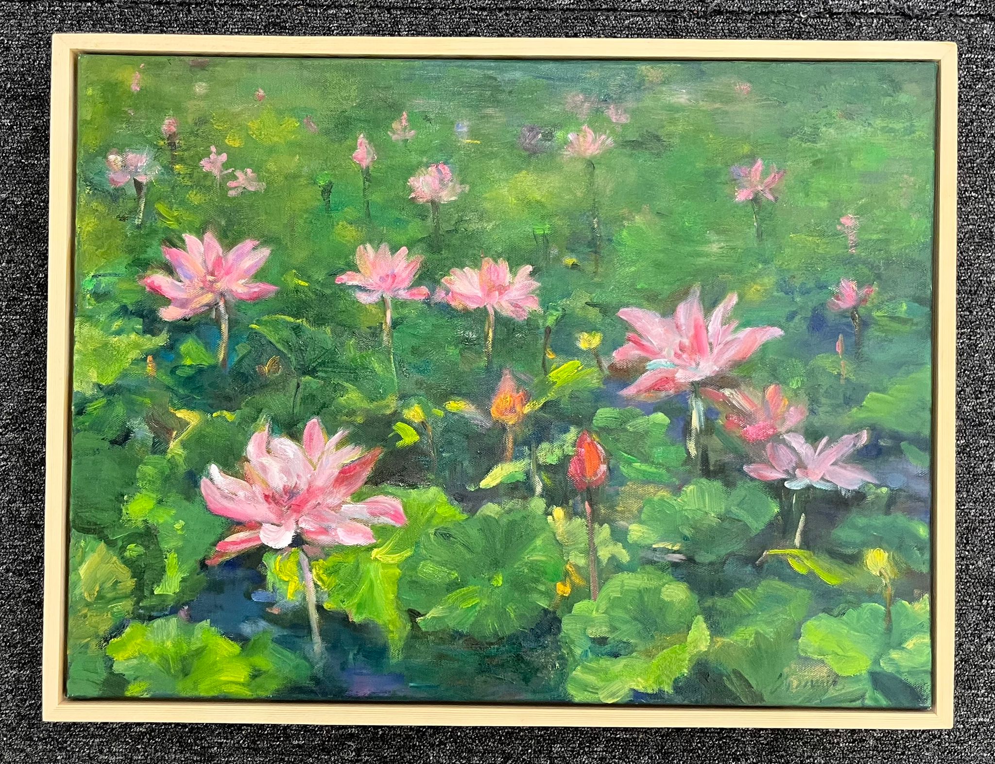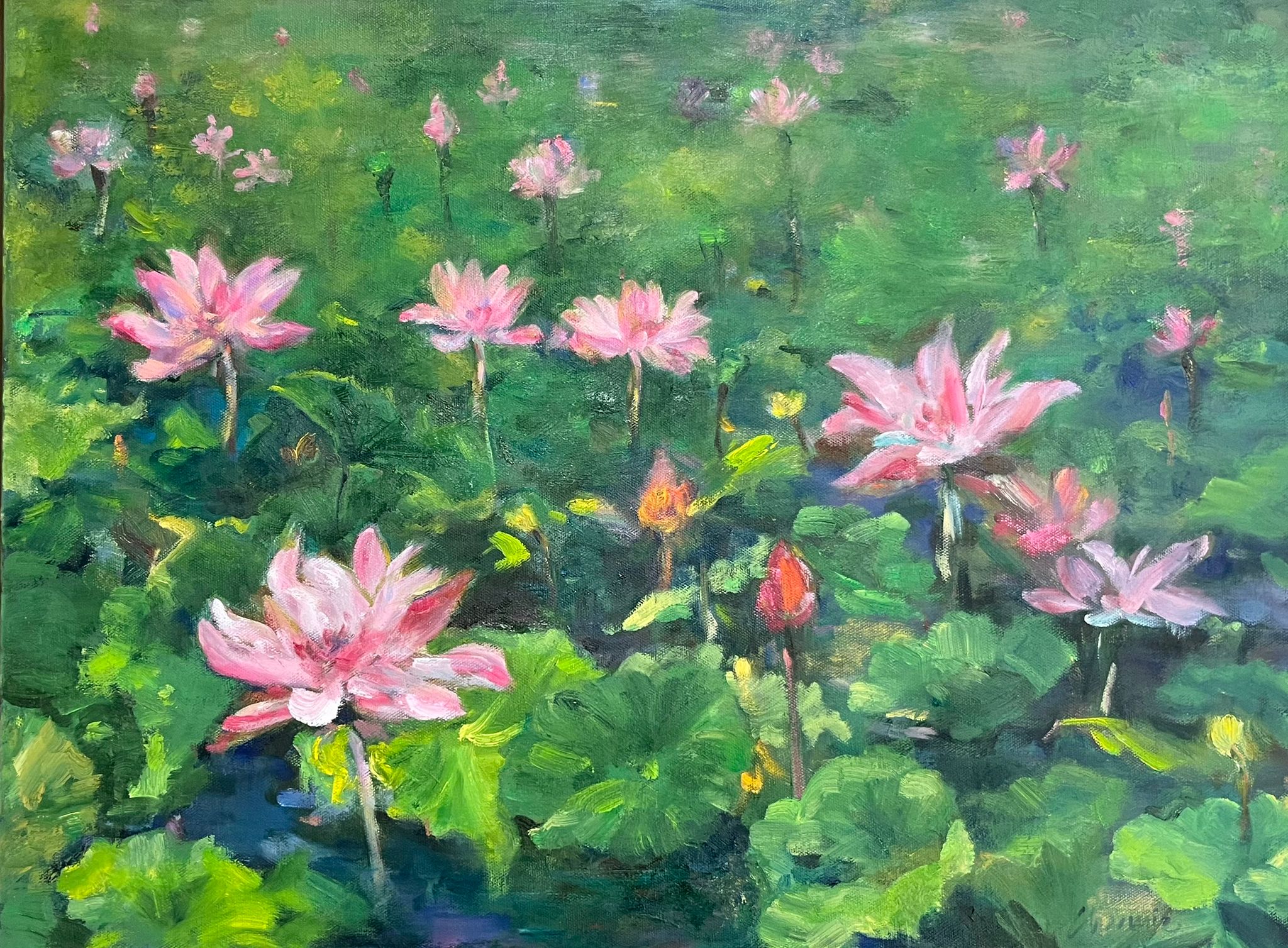 This oil painting depicts a serene pond filled with blooming pink lotus flowers rising above lush green leaves. The brush strokes are soft and impressionistic, blending vibrant greens with delicate pinks to create a dreamy, tranquil atmosphere.