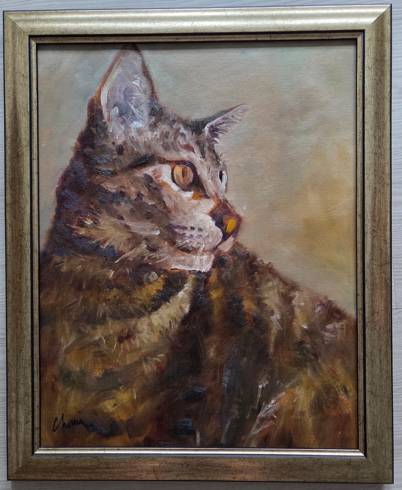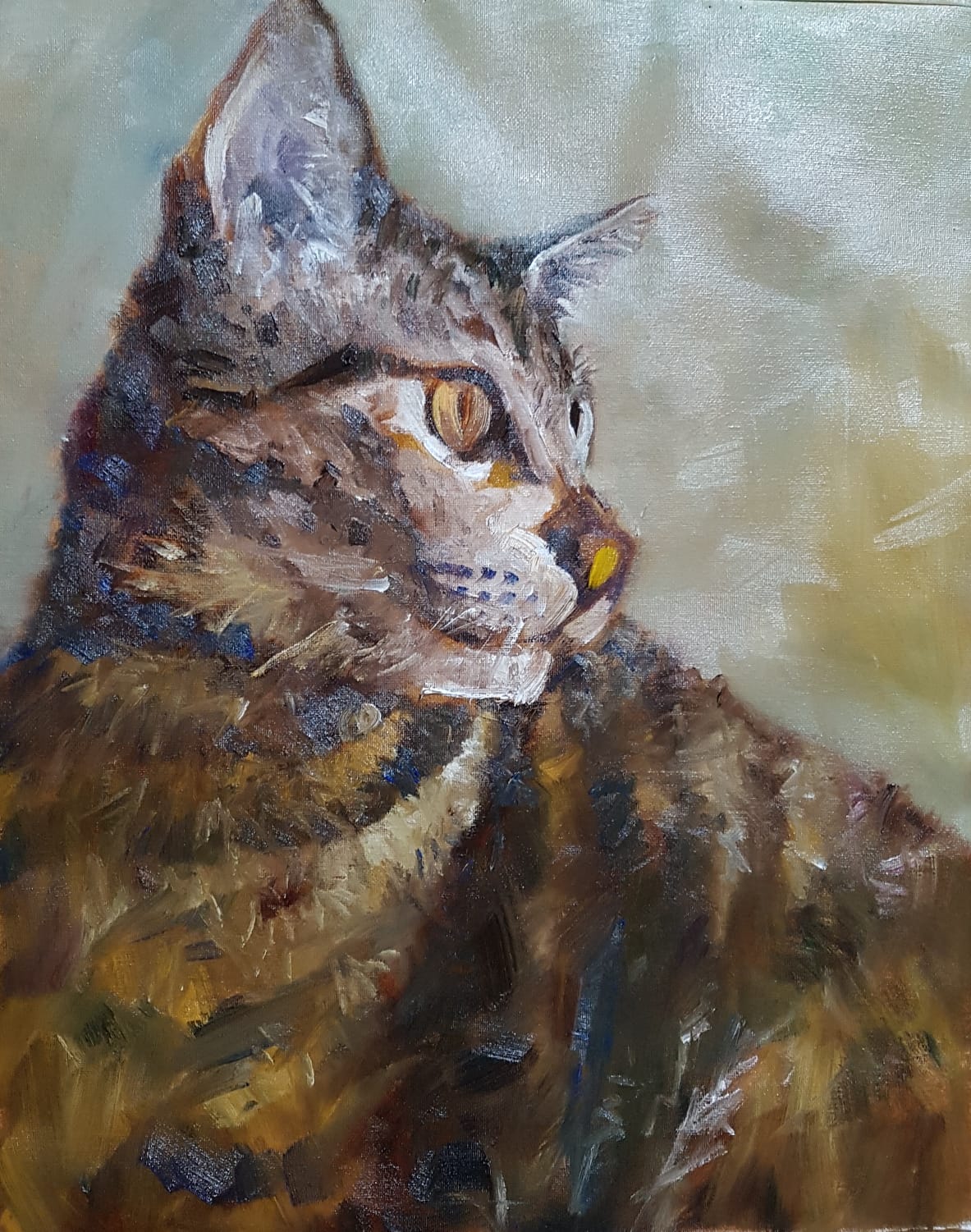 The artist uses loose, visible brushstrokes to build the fur, blending warm browns, ochres, creams, with hints of black and blue. The background is soft and muted, composed of pale, neutral tones that contrast with the richer colors of the cat. This simplicity helps the subject stand out without distraction. Overall, the painting balances realism and abstraction, capturing both the physical likeness and the quiet personality of the cat.