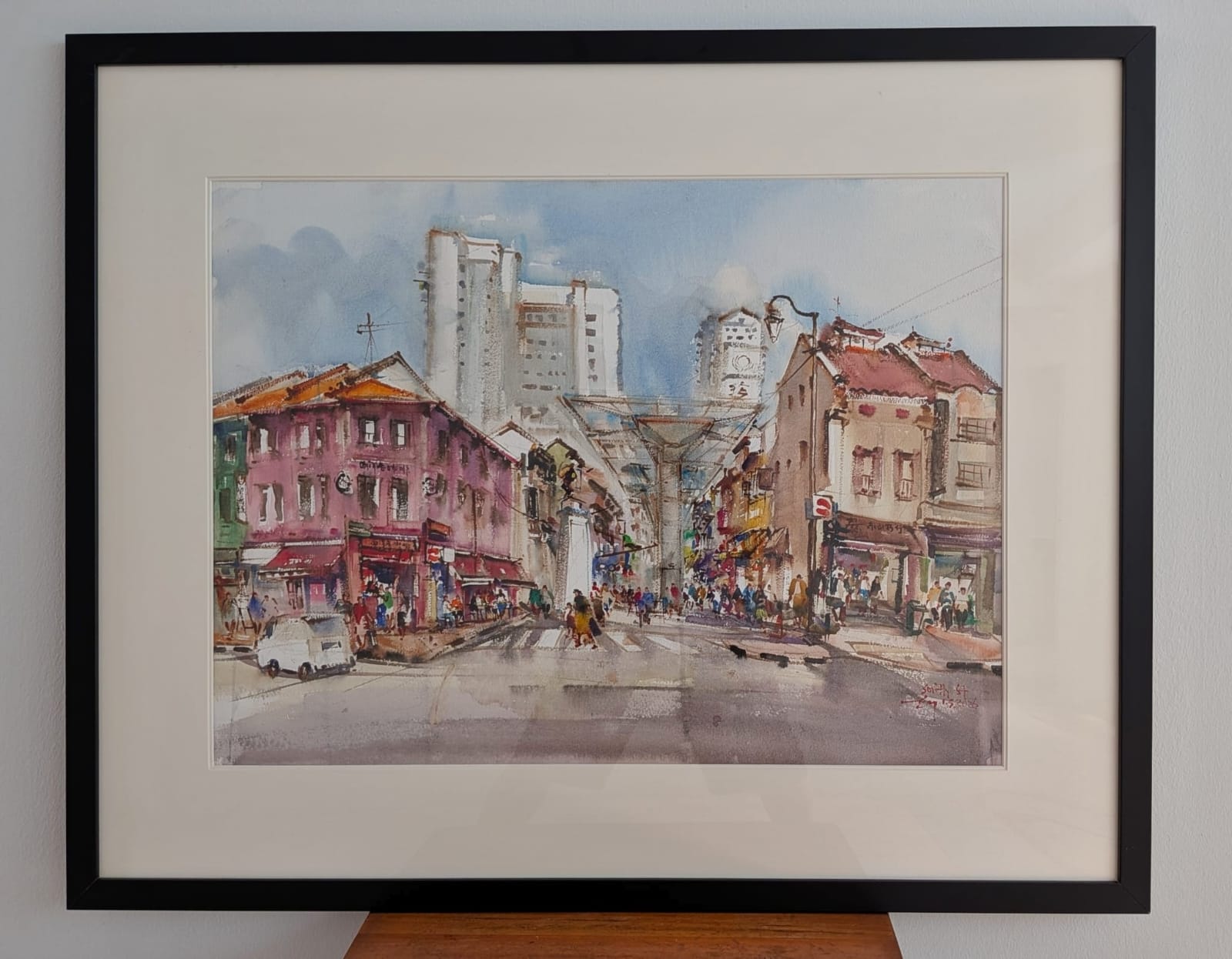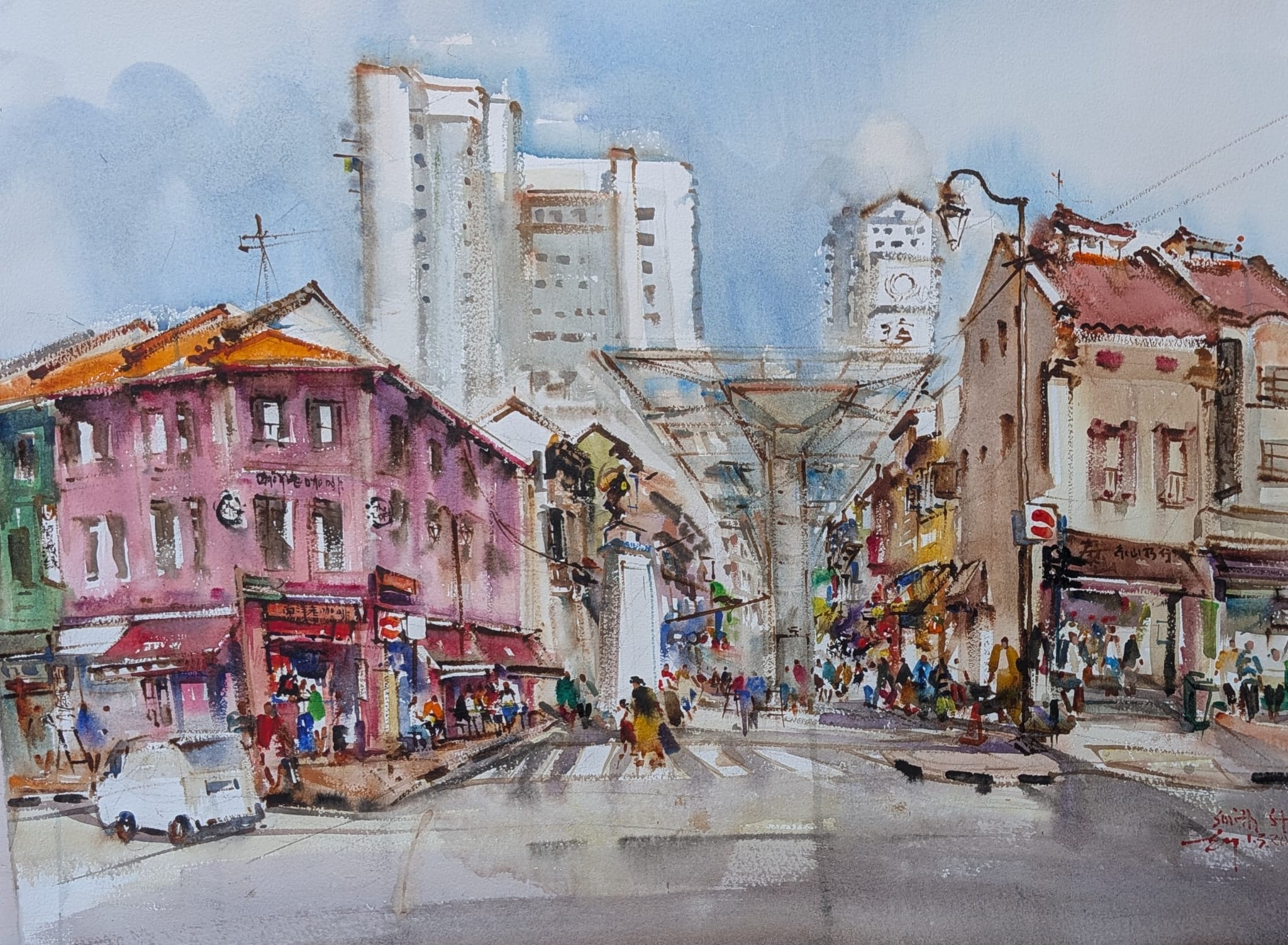 This watercolor painting captures a lively, busy Chinatown. Colourful shophouses line both sides of the road, bustling with people and small businesses. A covered walkway structure runs down the center, drawing the eye into the depth of the composition. Loose brushwork and gentle washes give the scene a light, atmospheric quality, conveying both movement and everyday life in a vibrant city setting.
