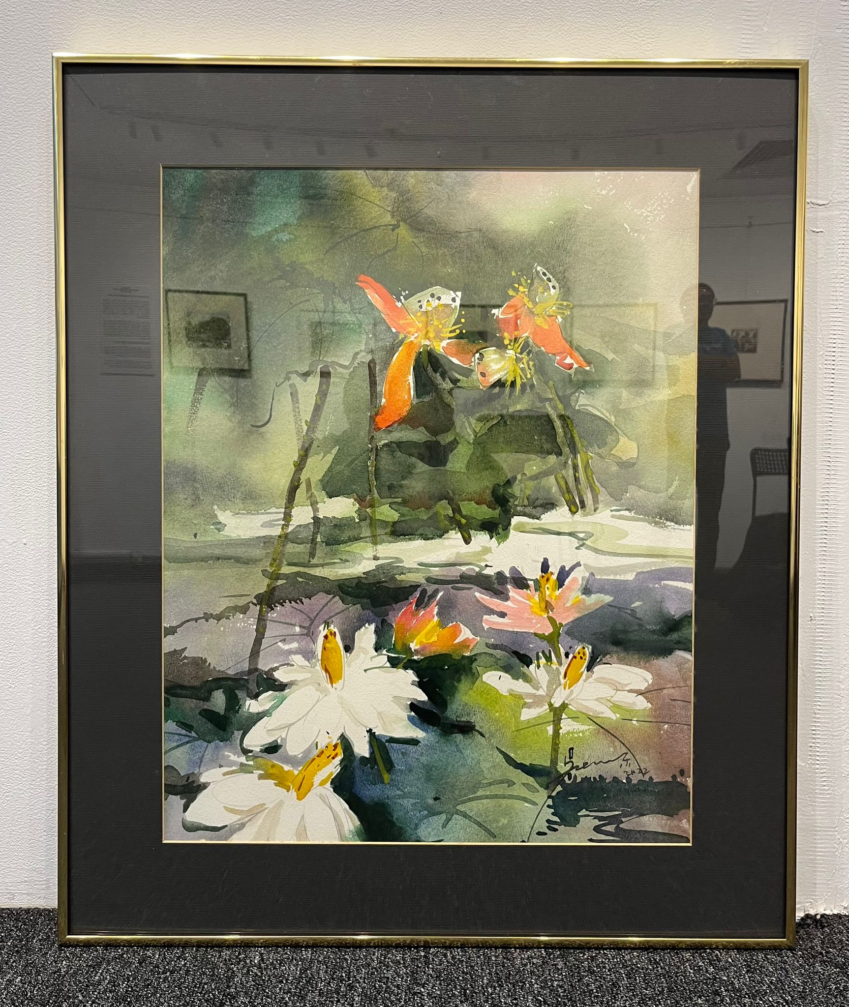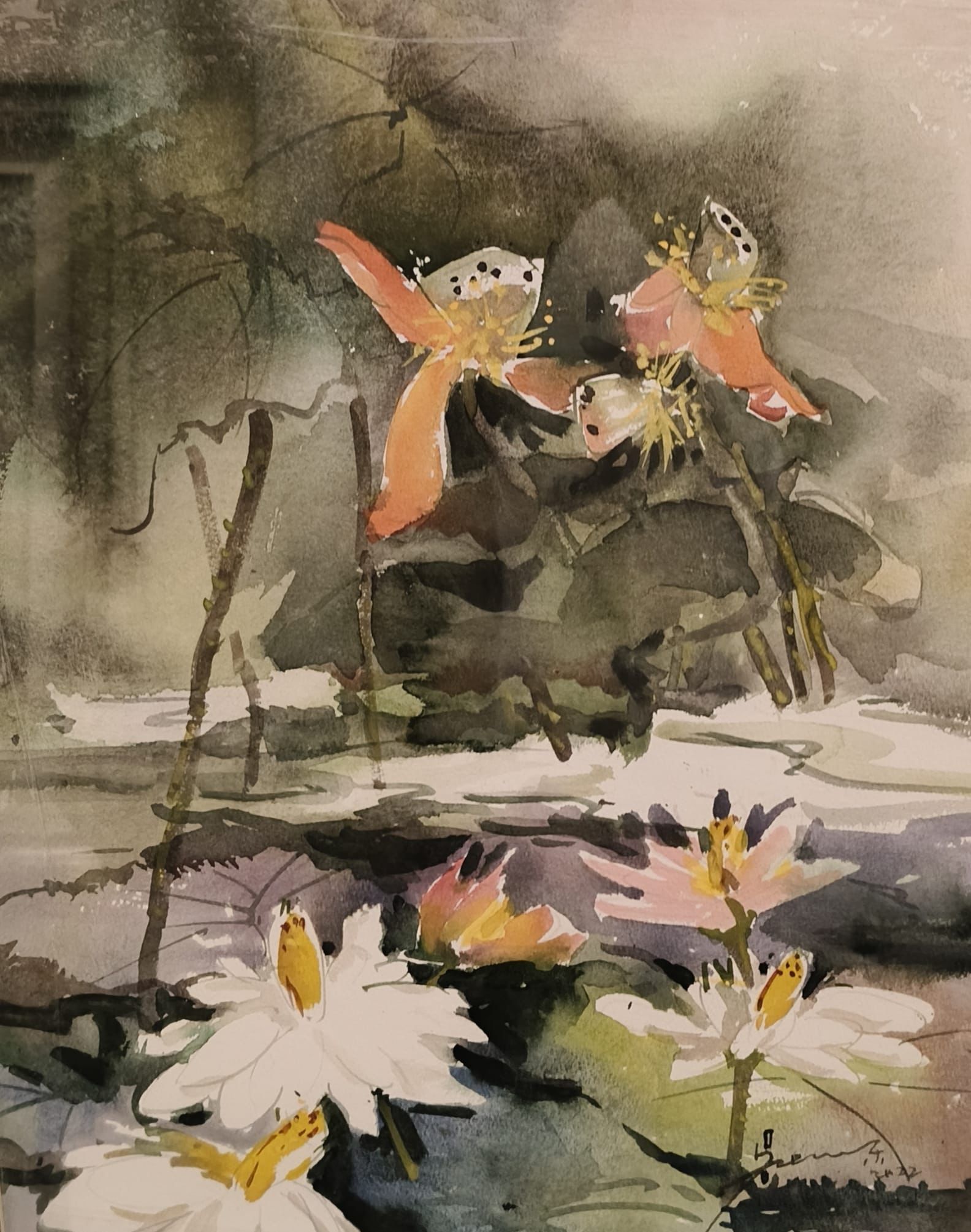 In this atmospheric painting of lotus flowers and lotus leaves, the artist has incorporated Chinese ink techniques by leaving white spaces for the petals and the pond. If you observe closely, the white petals are not painted, but intentionally left unpainted.