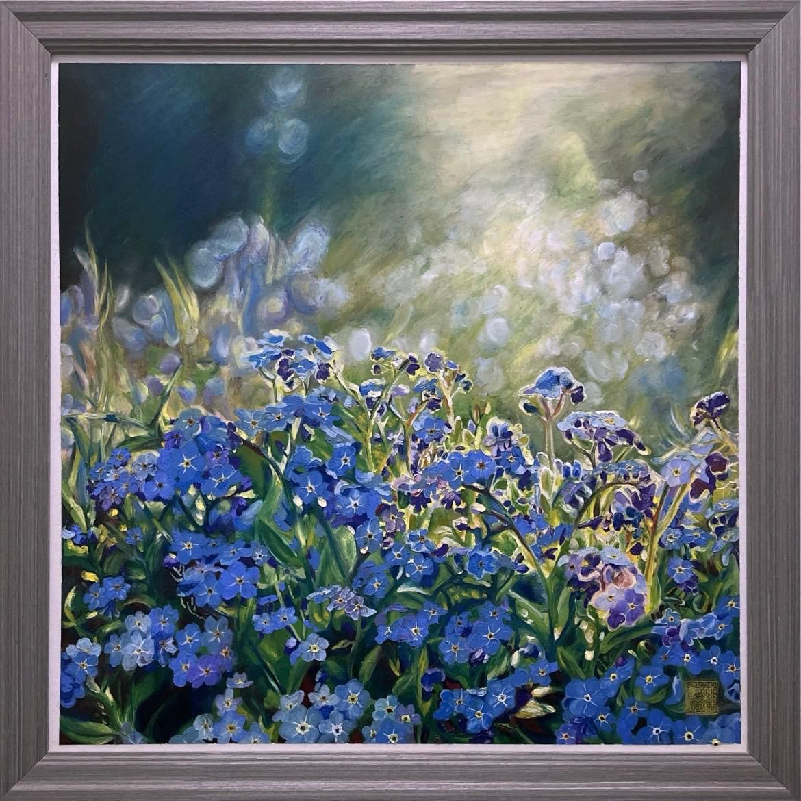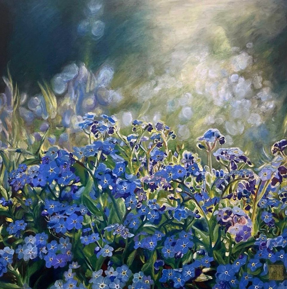 Forget-me-not flowers symbolize enduring love. The artist reflects on the loss of memories, gently cherishing what remains.