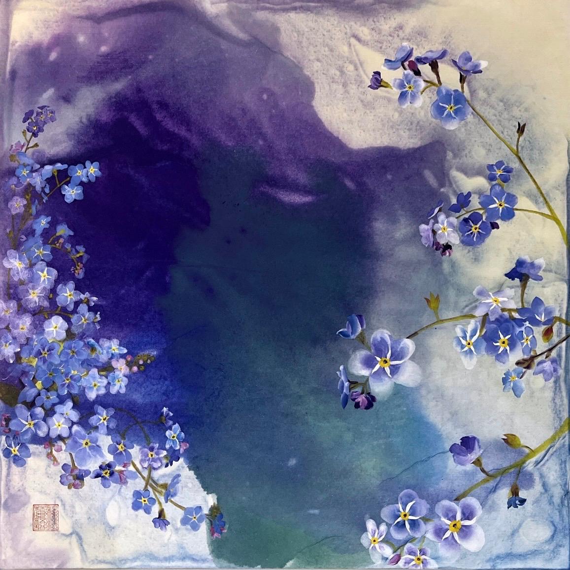 This Chinese ink painting of forget-me-not flowers (勿忘我) uses traditional pò mò (泼墨) and liú bái (留白) techniques to invite quiet introspection.
